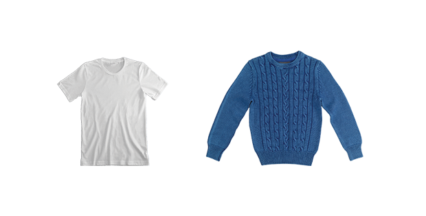 - Les vêtements : pantalons, chemises, t-shirts, pulls, robes, manteaux, joggings, sweat-shirts, chaussettes, sous-vêtements, gants, écharpes, bonnets, foulards, caleçons, maillots de bain, collants, layettes, etc.