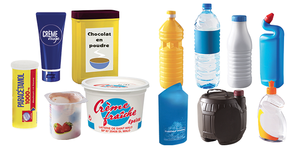 Les flaconnages, bouteilles, pots, boîtes, barquettes en plastique, les films en plastique, etc