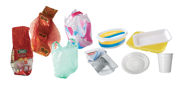 Les flaconnages, bouteilles, pots, boîtes, barquettes en plastique (bouteille d'eau, flacon de liquide vaisselle, gel douche, lessive, pot de yaourt ou de crème, barquette alimentaire), les films en plastique (sacs de magasins, suremballages de pack d'eau, de lait, de papier toilette, filet de fruits, film alimentaire...), etc.