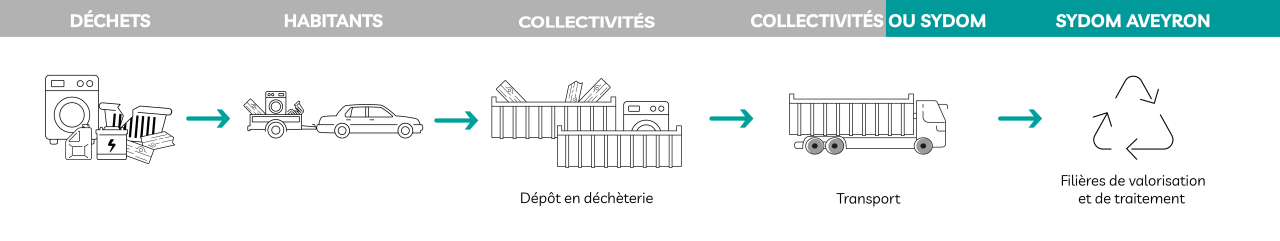 - Le SYDOM n’intervient qu’après la collecte des déchets ménagers et assimilés et a pour missions le regroupement, le transport, la valorisation et le traitement de ces derniers.